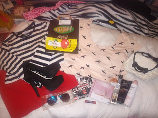 Black & white top, bird top/dress, bag, Cherry Coke lipbalm & (AMAZING) platform shoes - Primark